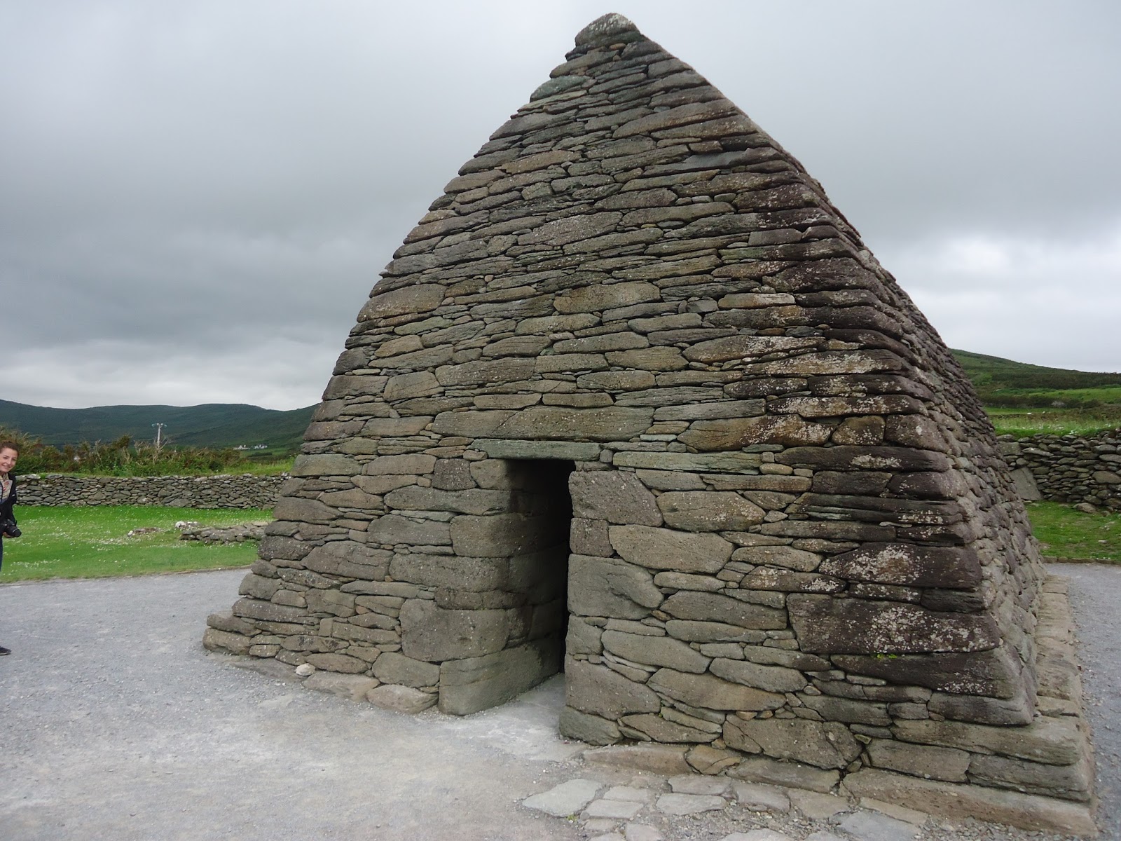 Beehive huts or Clocháns are dry-stone buildings dating from c.2000 BC. They are usually round in shape, but rectangular huts are known as well. What gives these huts their distinctive appearance is a building technique known as corbelling, i.e. the layering of stones, with each layer bending slightly closer and narrower towards the peak. Stones were laid with an outward and downward tilt to shed water, making these huts watertight. |